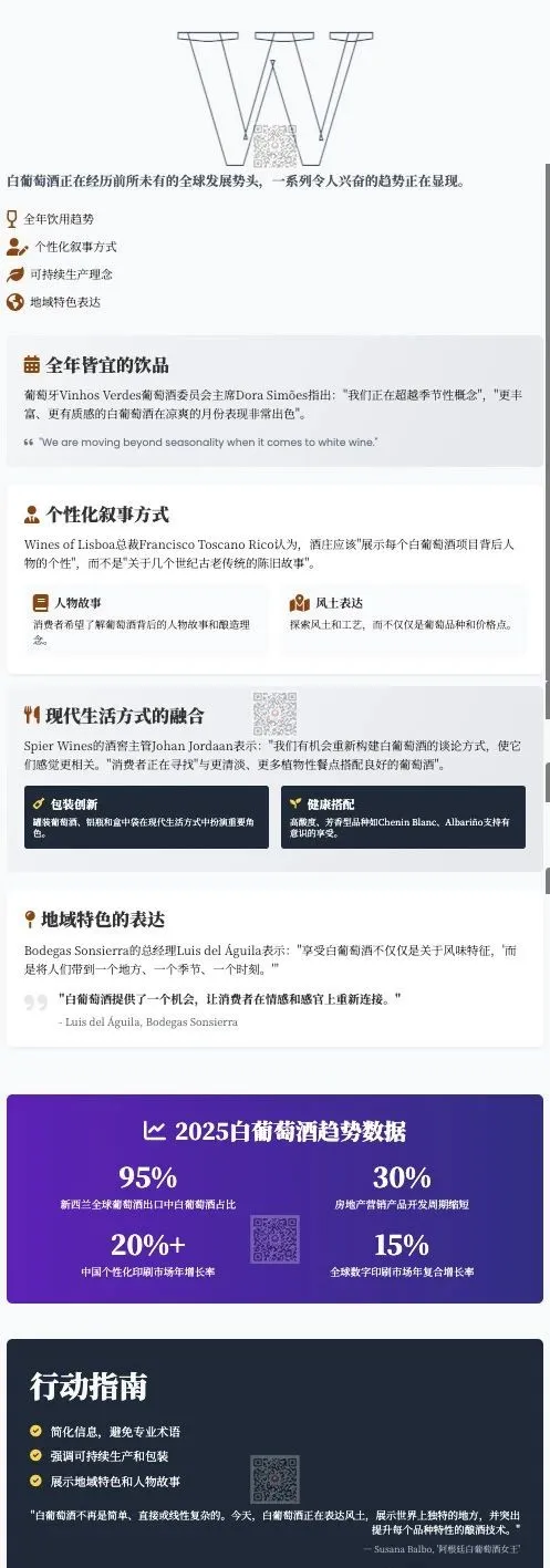 阿根廷"白葡萄酒女王"总结道:“行业应向消费者传达,现代白葡萄酒不再简单直白,而是能表达风土、突显地域特色、展现复杂工艺的精品。